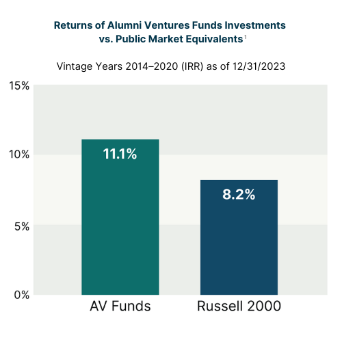 *Top-Quartile for AV Fund vintages 2016-2020 as of September 30, 2024. Top Quartile ranking against Cambridge Associates’ peer group for venture capital, according to the Distributions to Paid-in Capital (DPI) metric. Top-Quartile for 2016 vintage was .77 for Cambridge Associates peer group and .72 for Alumni Ventures funds. Past performance does not guarantee future results.