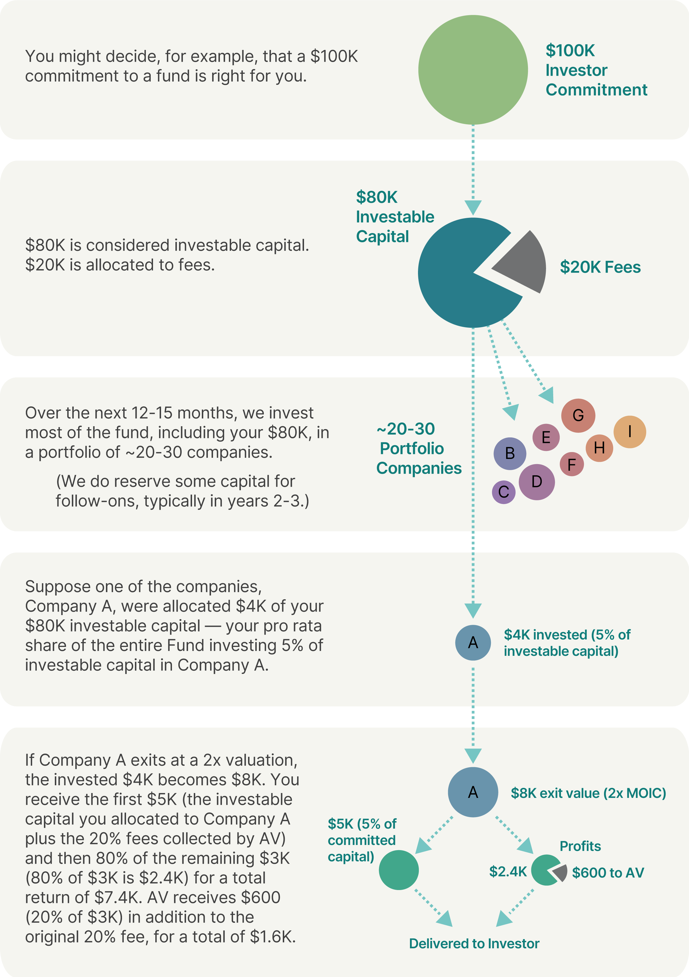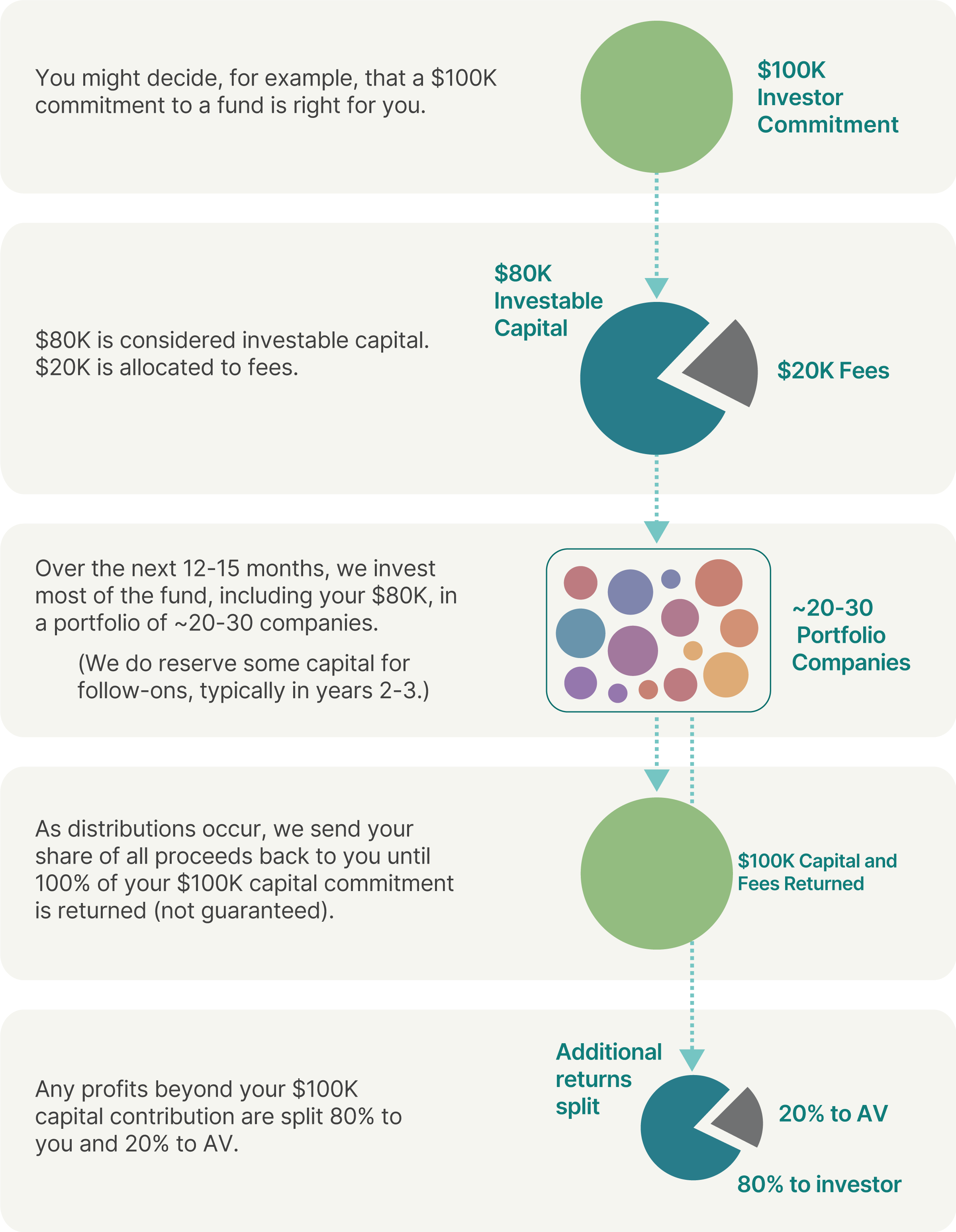 We collect capital just once at the beginning of each investment because it’s efficient, transparent, and convenient for our investors. It lets us focus on what you pay us for: accessing promising venture deals. We also deploy capital quickly, investing most of it within 12-15 months. AV collects its management fee when you invest and reserves a designated portion to cover future potential needs of the funds.