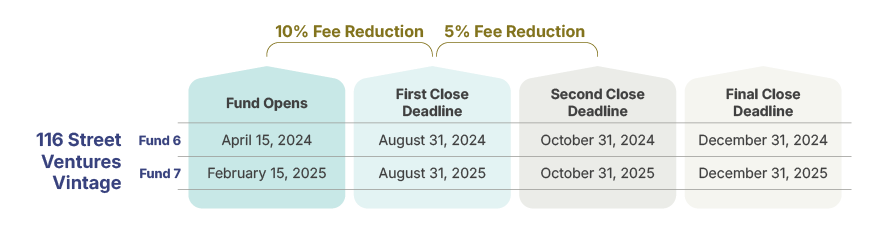 The fundraise deadlines of current and upcoming fund vintages are published below to help our investors with their personal venture allocation planning strategies. Read more about our Loyalty Rewards, Performance and Fees.